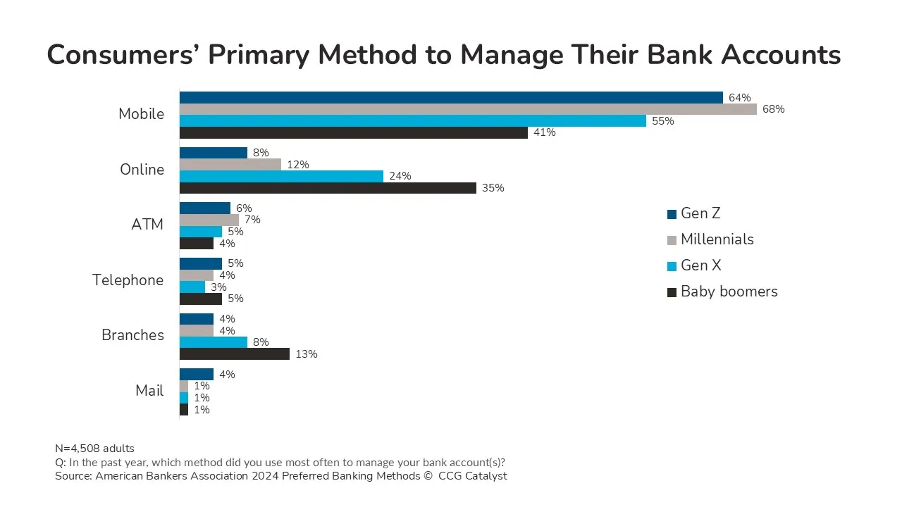 It’s well-documented that mobile is the primary or preferred banking channel for Gen Z and millennial consumers, and that digital overall dominates consumers’ interactions with their bank. According to an American Bankers Association survey, the most-used banking method for 64% of Gen Zers and 68% of millennials is mobile. The vast majority for each generation measured is digital.